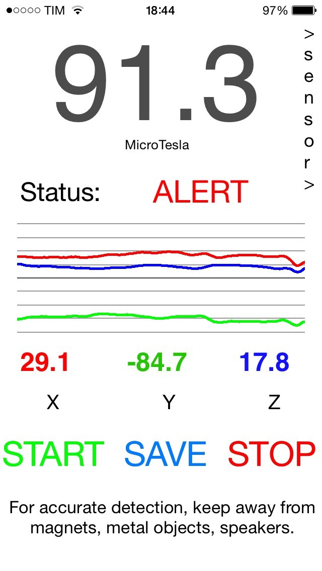 Premendo START, si avvierà il controllo delle onde elettromagnetiche, misurate in microtesla (l’unità di misura standard adottata per queste misurazioni) e un grafico molto utile, che ci mostra l’andamento di queste onde sui tre assi X,Y,Z.