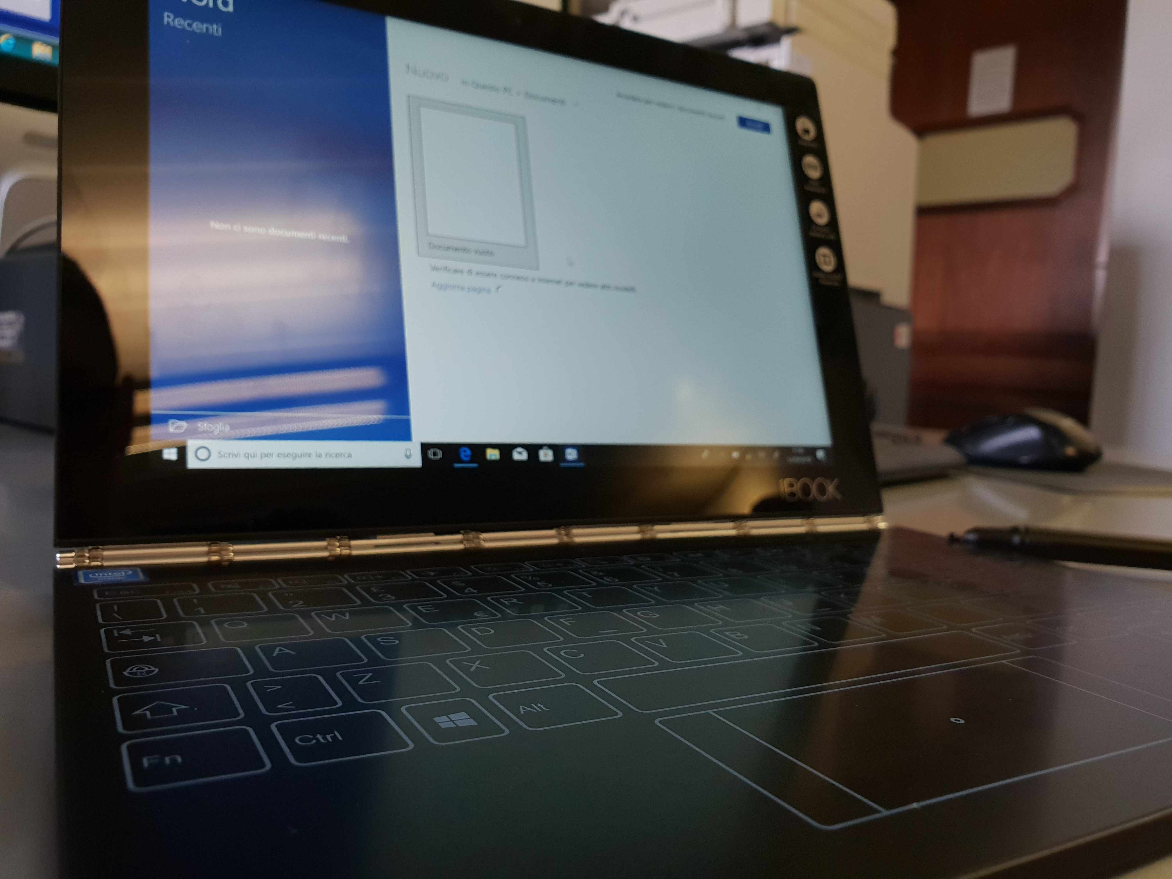 [amazonjs asin=”B01M6ZURVS” locale=”IT” title=”Lenovo Yogabook YB1-X91L Convertibile con Display da 10.1″ FullHD, Processore Intel Z8550 Atom, RAM 4 GB, 64 GB eMMC, Scheda Grafica Integrata, S.O. Windows 10 Pro, Nero Carbone, 4G/LTE, Tastiera Italiana”]