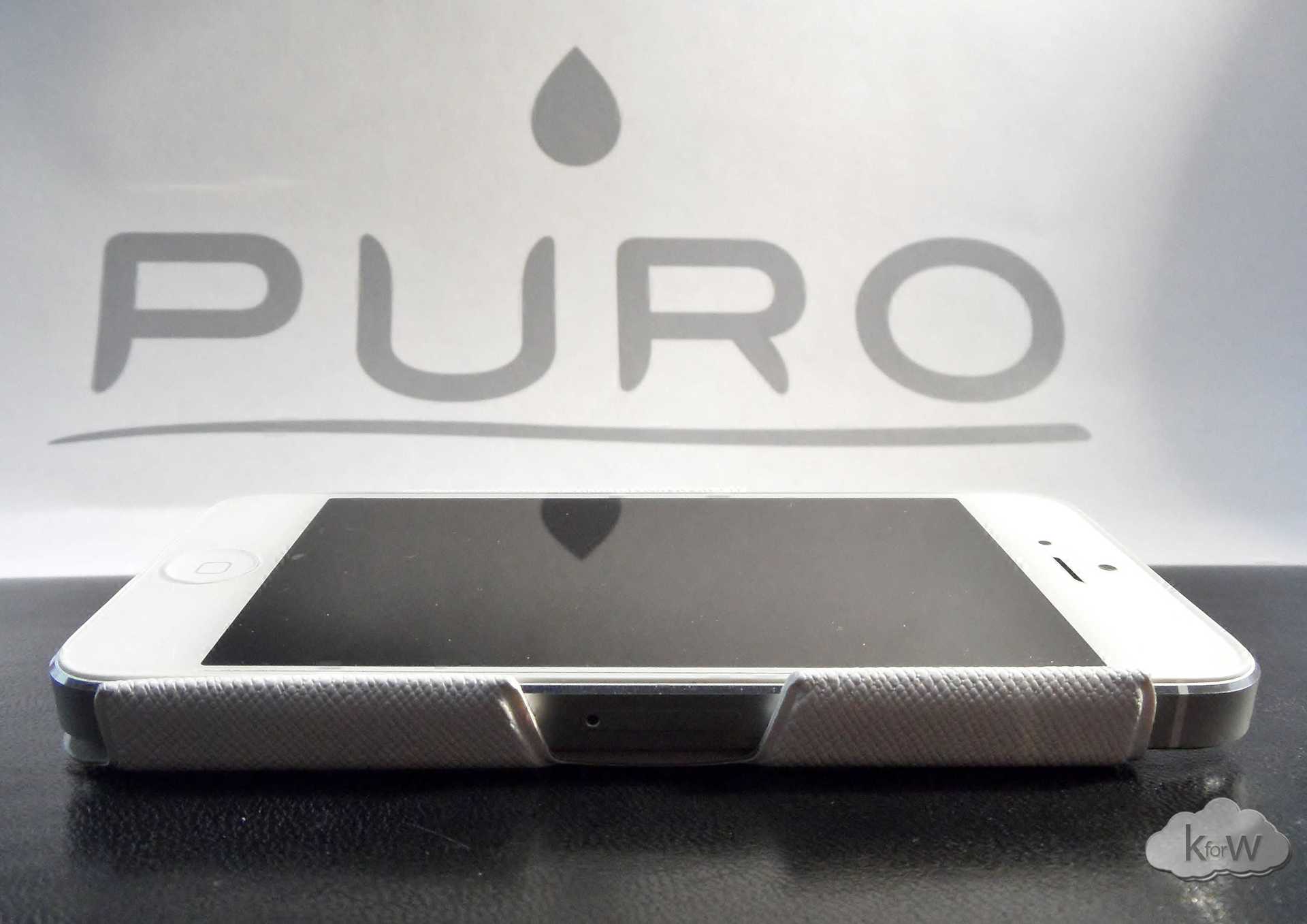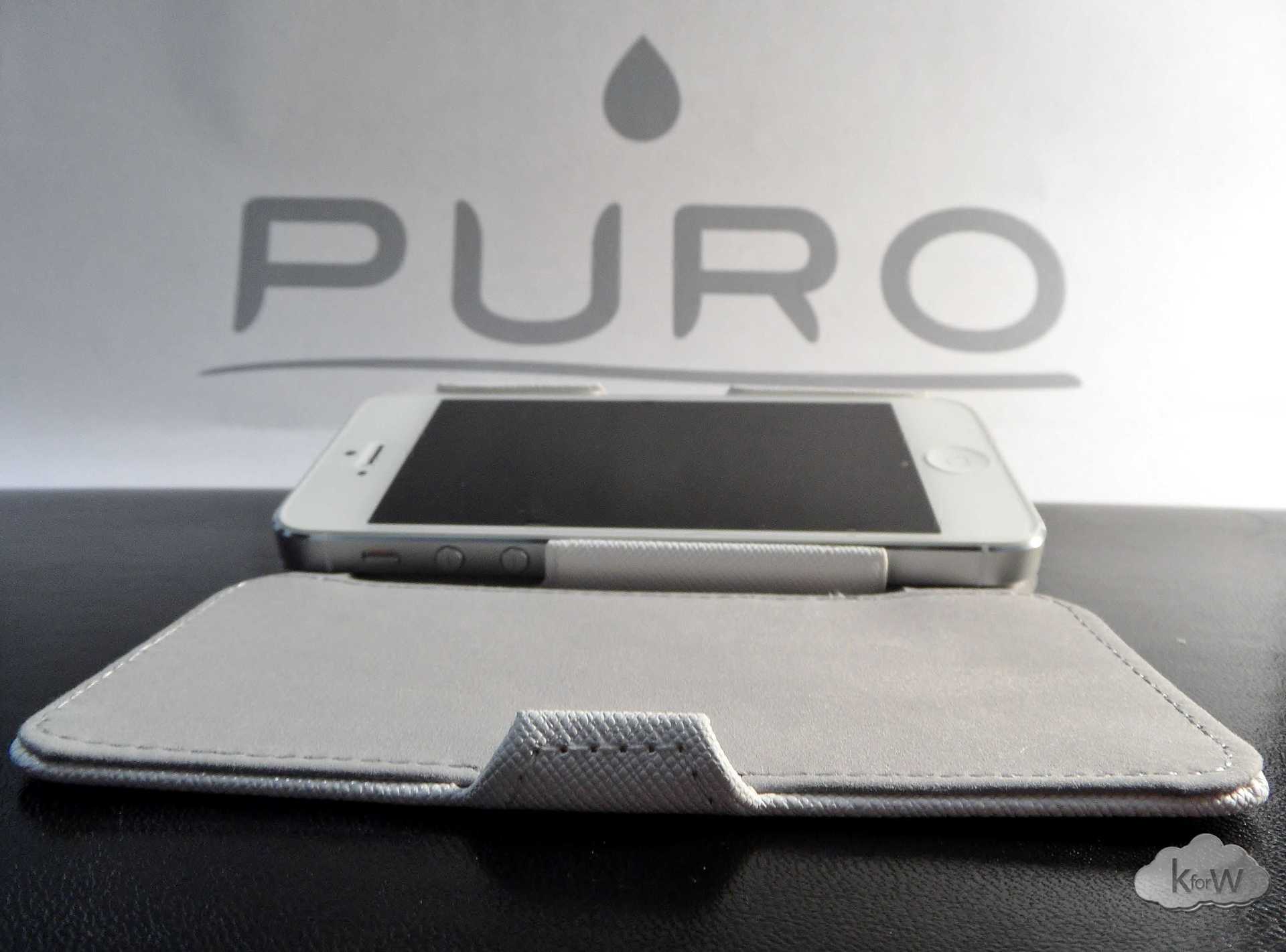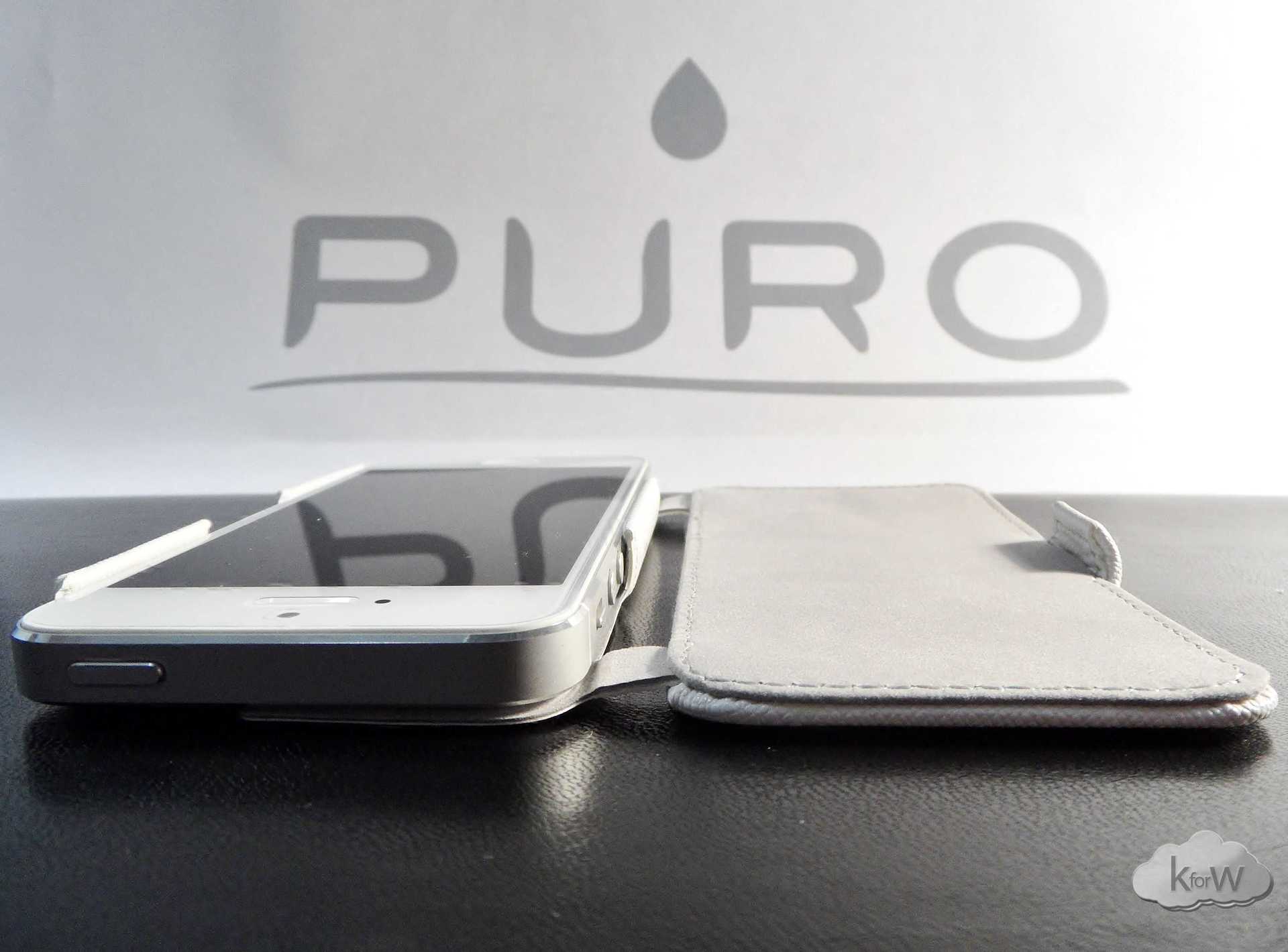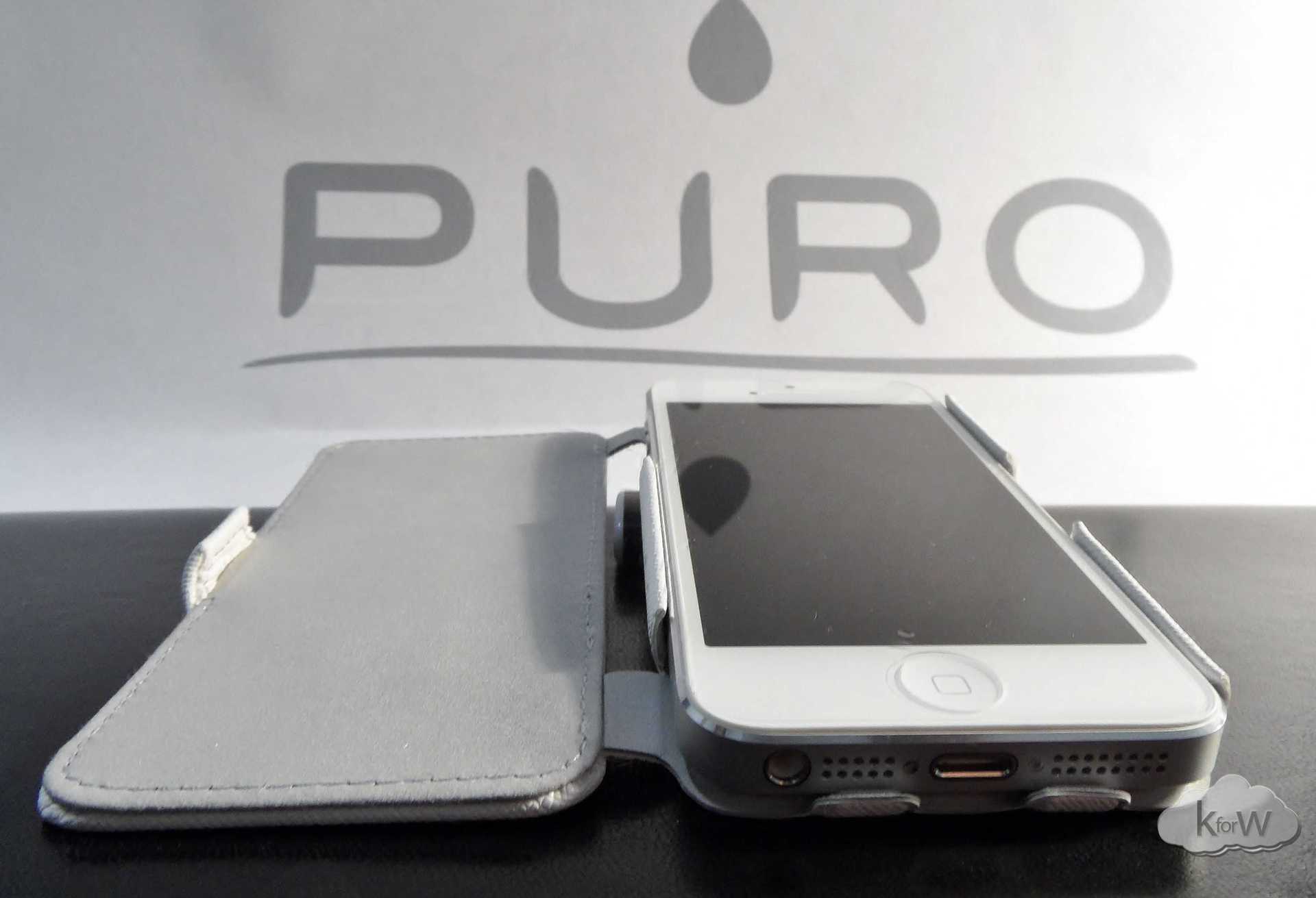 La parte frontale della Booklet Ultra Sim è liscia e risalta grazie al logo Puro stampato sulla parte inferiore, mentre sul retro copre completamente l’iPhone 5 lasciando però libera sia la fotocamera che il flash led del device.