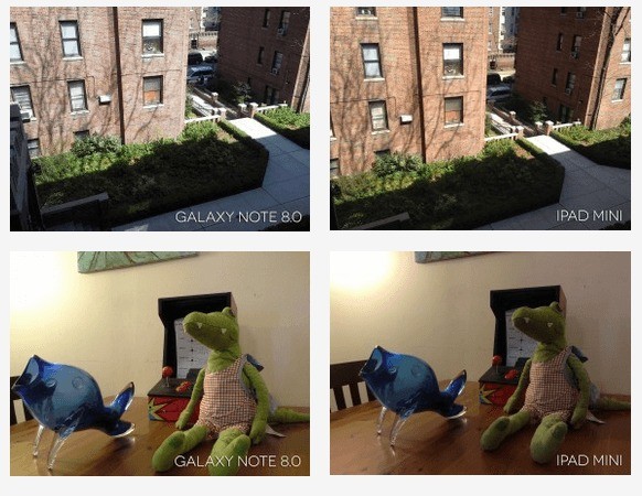 Il comparto multimediale del note 8.0, si avvale di due fotocamere: quella posteriore è di 5 mega pixel mentre quella anteriore è di 1.3 megapixels. La qualità delle foto è in linea con i concorretti della stessa fascia di mercato tuttavia le foto del prodotto Samsung risultano con colori leggermente più caldi rispetto ad altri tablet. Infine da non sottovalutare la lunga lista di opzioni software legate alla fotocamera, fornite gratuitamente dal produttore coreano. Tali applicazioni contribuiscono sicuramente a valorizzare la fotocamera del note 8.0.
