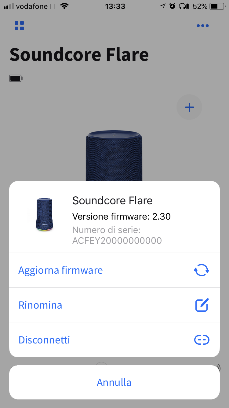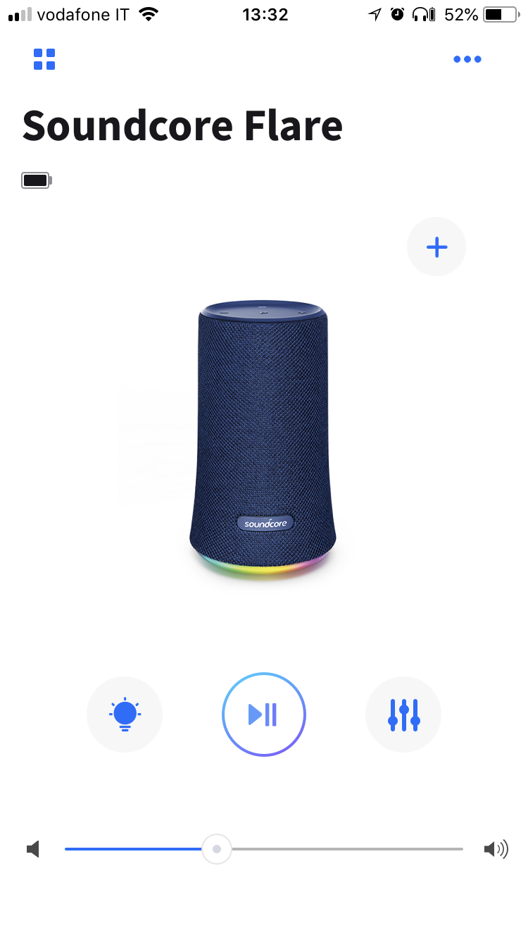 Già dalla schermata principale, dopo aver connesso il dispositivo, è possibile notare: l’icona del prodotto collegato, il nome (personalizzabile fino a 15 caratteri), il livello di autonomia rimasta, un tasto “+” per collegare ulteriori casse, il tasto PLAY/PAUSA, un tasto equalizzare, uno adibito alla regolazione dei LED ed infine, lo slider per aumentare e diminuire il volume.