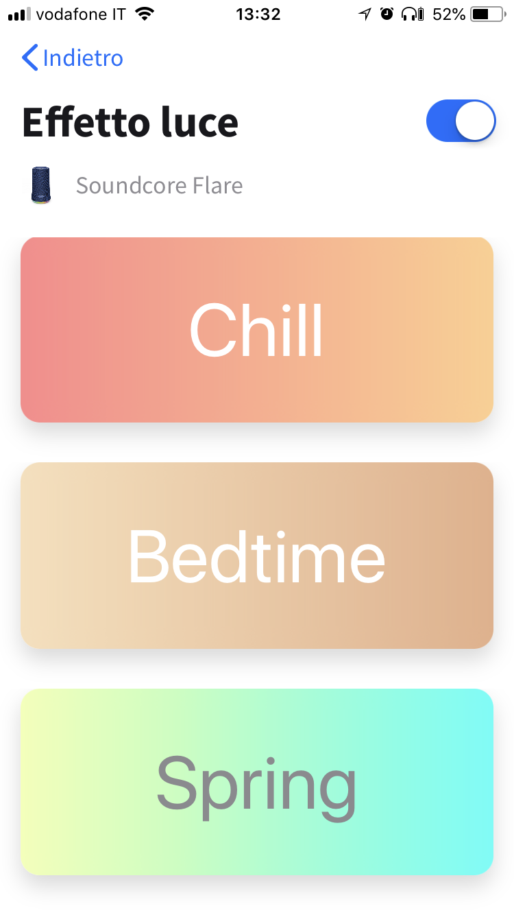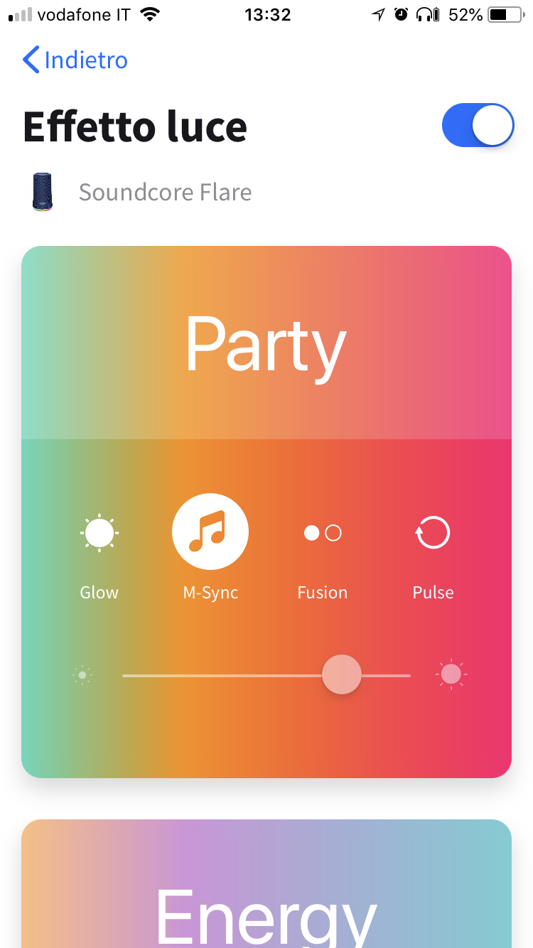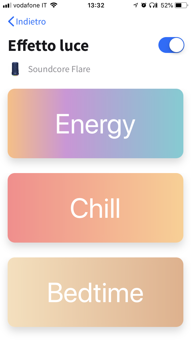 Gli effetti luce possono essere appunto personalizzati, scegliendo tra cinque temi pre-impostati: Party, Energy, Chill, Bedtime e Spring. Ognuno di essi può essere poi personalizzato attraverso la regolazione di alcuni parametri. L’equalizzazione si basa invece su stili già perfettamente definiti e resi più chiari da una visualizzazione ”a onde” sul display. Nelle impostazioni generali infine, è possibile aggiornare il firmware, rinominare il dispositivo e disconnetterlo.