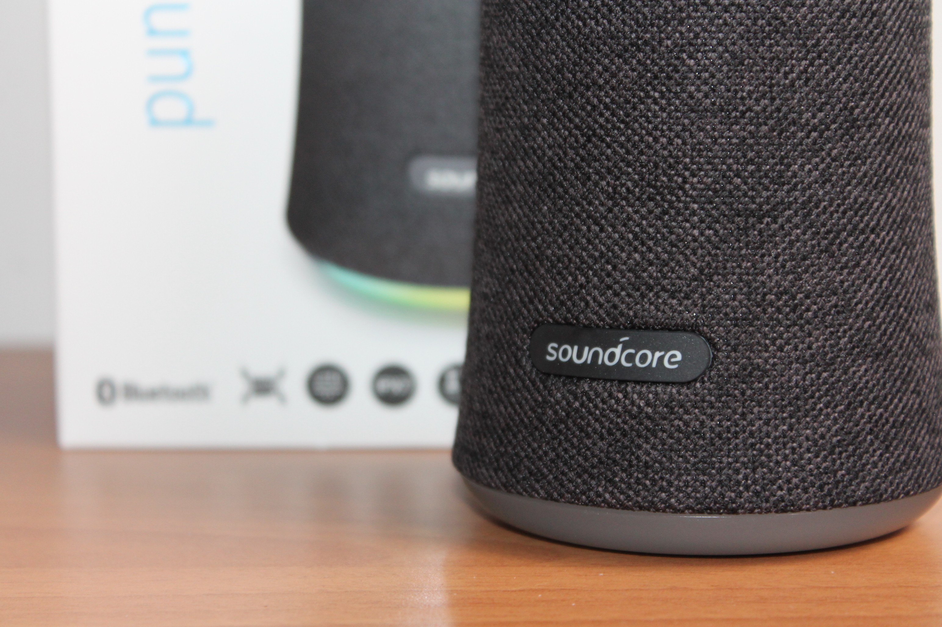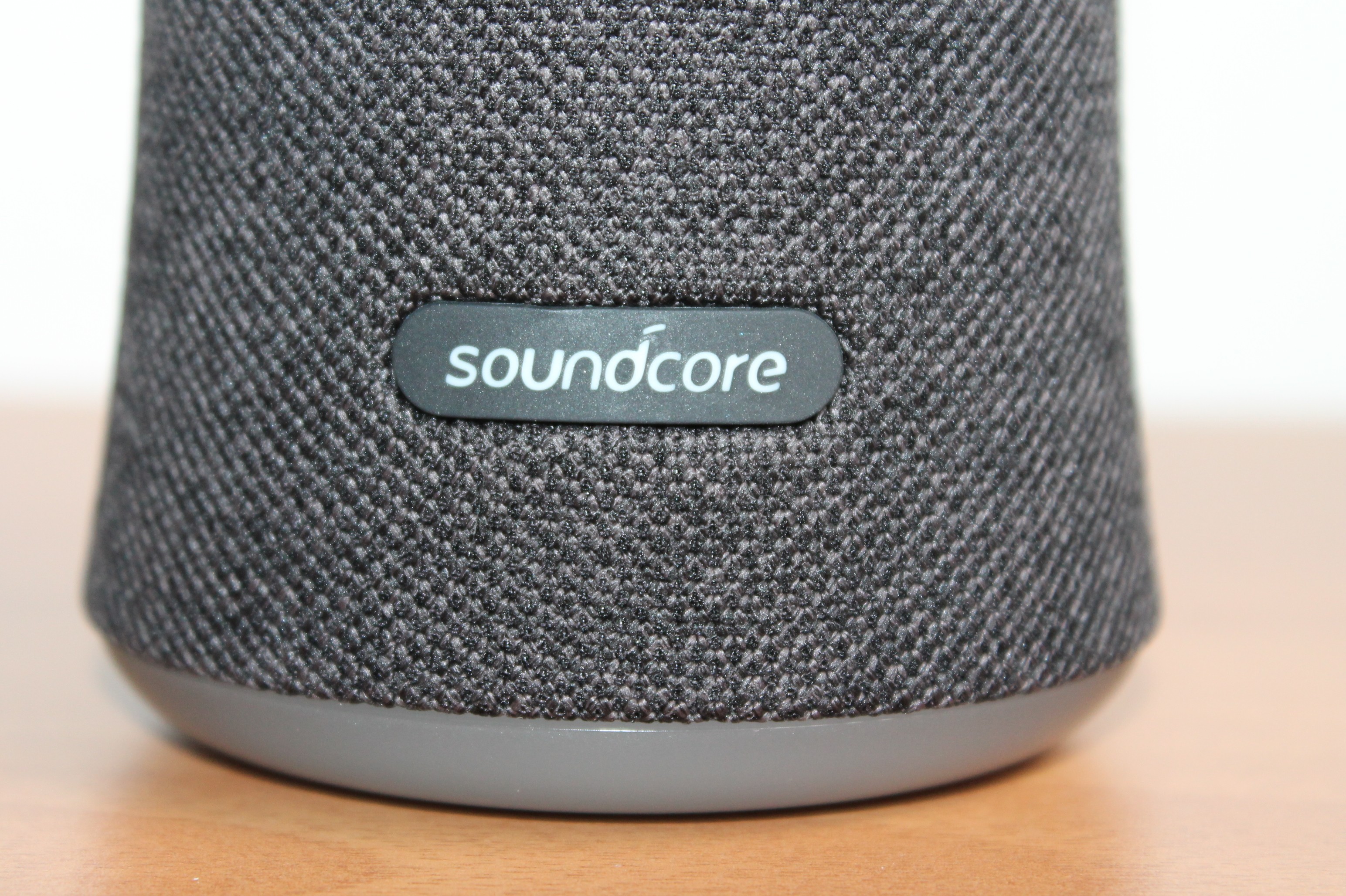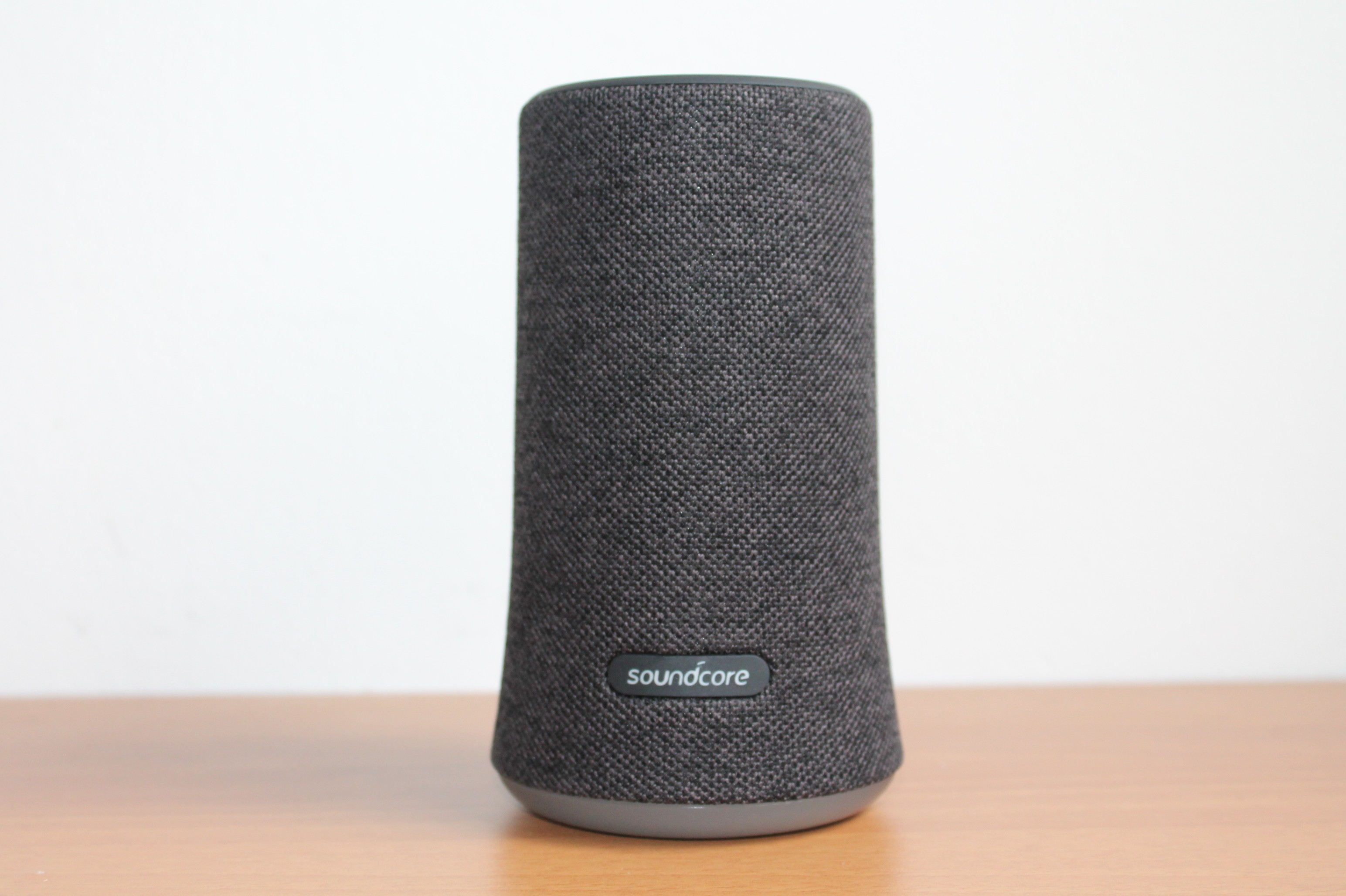 Lo speaker Soundcore Flare si presenta come un cilindro “a zampa di elefante”, ovvero leggermente più largo alla base e poi va a stringersi in una circonferenza perfetta. Tutto ciò implica una componente acustica a 360 gradi di cui più tardi approfondiremo le caratteristiche. L’intero rivestimento è in tessuto (simile al Google Home), molto gradevole al tatto e che dona un tocco di eleganza in più, interrotto soltanto posteriormente per consentire l’inserimento dei tasti accensione e bluetooth e le entrare micro USB e Jack da 3.5 mm.
