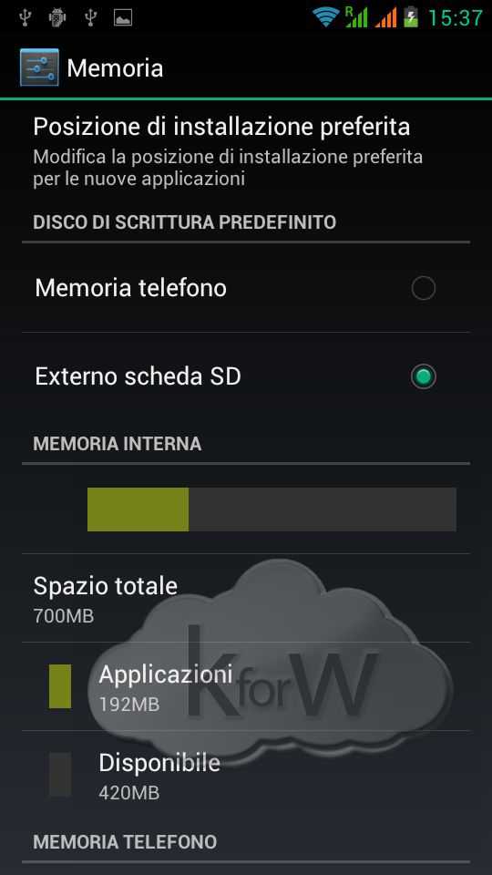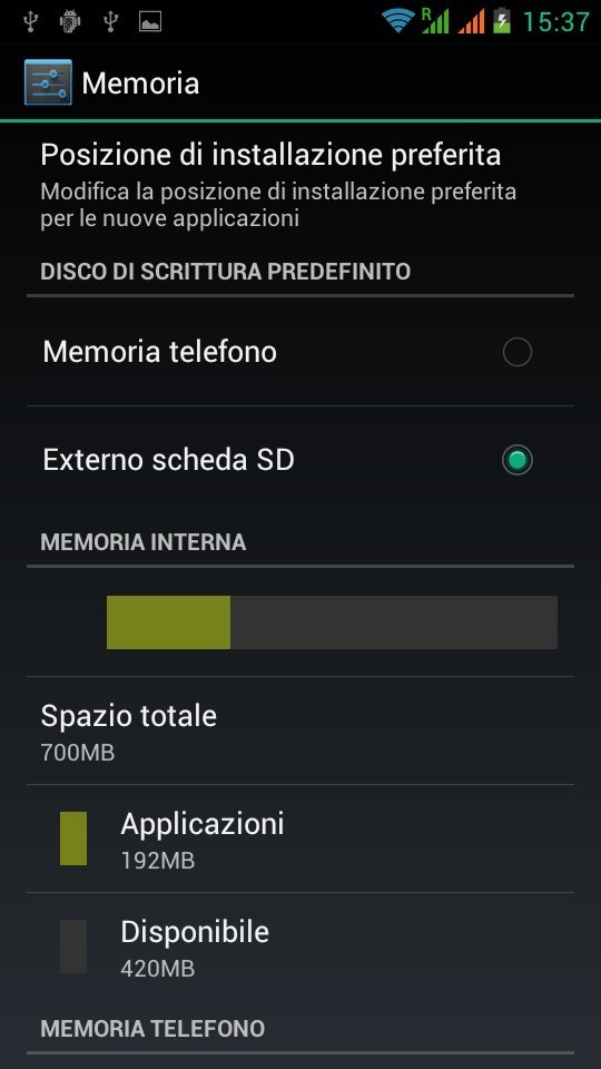 Lo smartphone è dotato di 4 Gb di memoria interna espandibile fino a 32 tramite slot microSD. Con il device viene fornita anche una microSD da 8 Gb per un totale di 12 Gb e c’è la possibilità di scegliere la posizione di installazione delle applicazioni, in modo da non appesantire la rom interna. La Ram è di 1 GB dei quali circa 700 Mb vengono lasciati sempre disponibili dal sistema operativo che la gestisce, dunque, in modo assolutamente funzionale.
