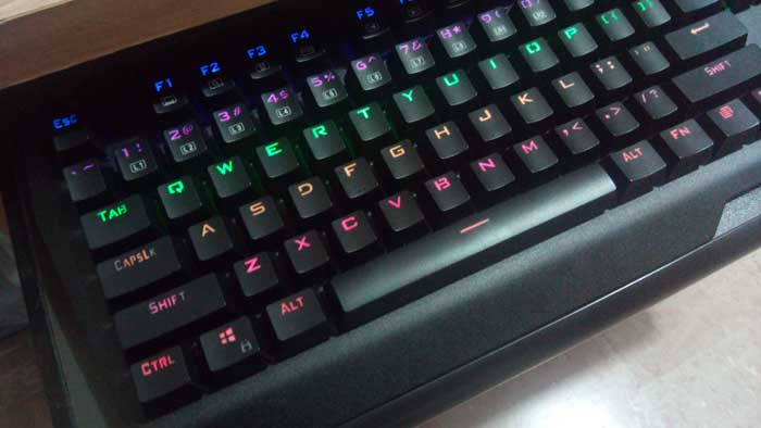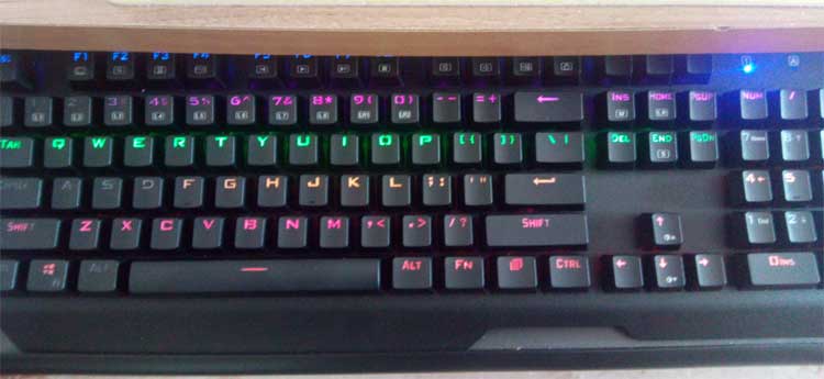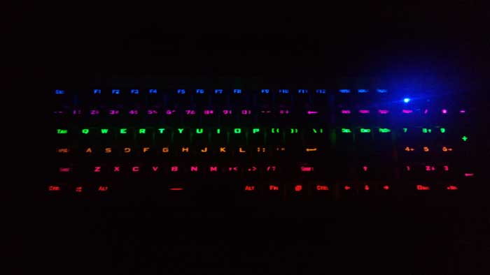Si tratta di una tastiera retroilluminata RGB, con diversi colori per i tasti. In due parole ogni fila di tasti presenta un colore diverso. La retroilluminazione non è personalizzabile via software perchè è un dispositivo plug & play (si installa automaticamente senza programmi) e non sono presenti dei tasti per impostare macro, ma con un prezzo così basso su qualcosa si doveva pur risparmiare. Tuttavia la retroilluminazione si può personalizzare direttamente dalla tastiera, e questo permette di ovviare al problema del software. Sono presenti ben 8 modalità di retroilluminazione diverse con le quali è possibile illuminare diversi tasti nello stesso tempo. Ci sono anche delle configurazioni studiate appositamente per giochi FPS e RTS, oppure videogames specifici come Call of Duty e League of Legends. Addirittura è anche possibile creare una modalità personalizzata di retroilluminazione da memorizzare, scegliendo tasti a piacimento. Potete comunque non cambiare i colori dei tasti, ma scegliere quali tasti devono essere retroilluminati. E’ però possibile regolare l’intensità dell’illuminazione dei tasti a piacimento, nonchè attivare dei giochi di luce in movimento. Scontato dire che trattandosi di una tastiera meccanica le combinazioni di tasti che si possono premere allo stesso momento sono infinite. Voto: 8.