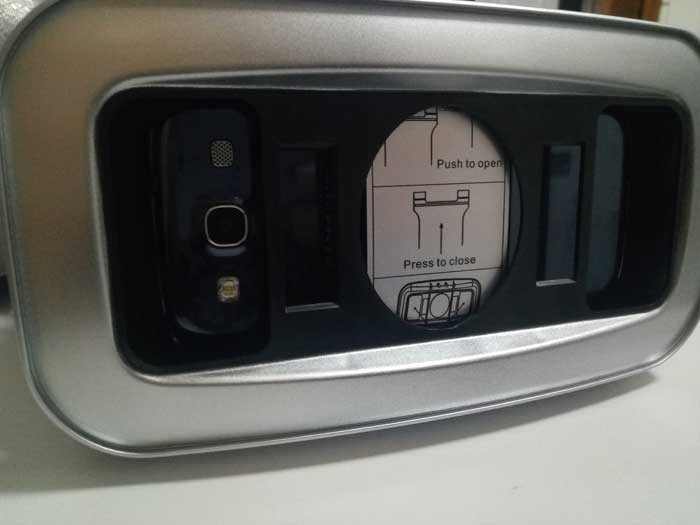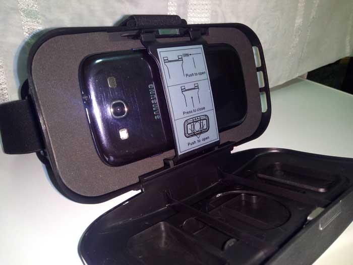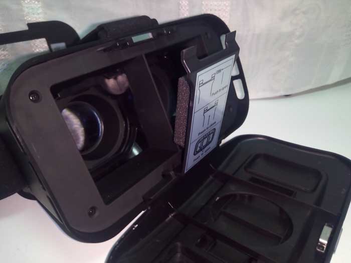 Questo visore per la realtà virtuale fa della qualità costruttiva uno dei suoi cavalli di battaglia. E’ realizzato interamente in plastica come tutti, ma risulta molto robusto. In più è bello da vedere ed ha una forma molto futuristica, con un pannello frontale lucido molto suggestivo che raffigura la mappa del mondo. Questo pannello è anche removibile, per lasciare spazio a dei fori per la fotocamera dello smartphone, che vi permetterà di usufruire di utili applicazioni per la realtà virtuale come Google Cardboard Fotocamera. Il visore è compatibile standard con gli smartphone dai display da 5 a 6 pollici, mentre se volete utilizzare device da 4 a 5 pollici dovete inserire il pratico supporto in spugna sottile incluso nella confezione (come potete vedere nell’immagine con Samsung Galaxy S3 che è inferiore ai 5 pollici).