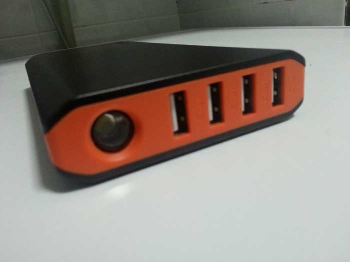EasyAcc Monster presenta sul lato laterale più corto ben 4 porte USB ed una torcia che si potrà utilizzare sfruttando la sua stessa carica. Sul lato lungo ci sono invece 2 porte micro USB che servono per la sua ricarica, mentre sul lato lungo opposto c’è il tasto per accendere il dispositivo e la torcia (che si accenderà premendo 2 volte consecutive); infine sulla parte posteriore sono presenti 4 luci LED bianche che servono per indicare la carica del dispositivo (se sono accese tutte e 4 è del tutto carico). Ma passiamo alla parte hardware e alle statistiche.