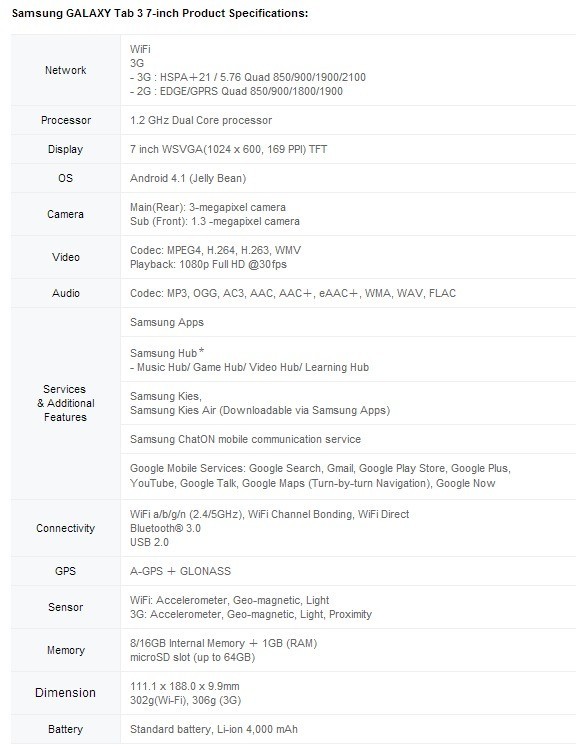 - Equipaggiato con display da 7 pollici con risoluzione 1024 x 600, processore dual-core da 1.2 GHz, memoria interna da 8/16 GB (in base al modello) espandibile fino a 64 GB tramite slot microSD, collegamento Wi-fi/Wi-fi + 3G (in base al modello), fotocamera posteriore da 3 megapixel ed anteriore da 1.3 megapixel, il tutto gestito da Android Jelly Bean 4.1.2 ed interfaccia proprietaria Samsung TouchWiz.