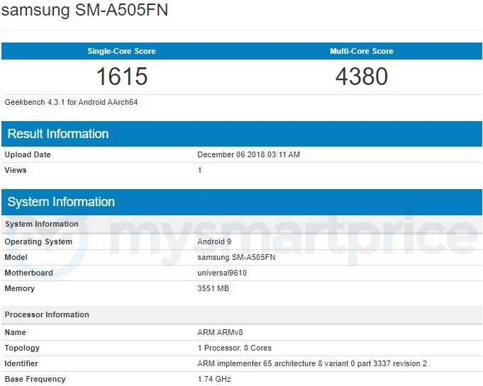 Sul fronte del software, sembra che il Galaxy A50 sarà disponibile con l’ultimo sistema operativo Android 9 Pie. I punteggi raggiunti sono di 1615 sul single-core e 4380 sul multi-core. Nulla di eccezionale, siamo più o meno allo stesso livello di uno Snapdragon 660 o 670. Ci aspettiamo che il Galaxy A50 e altri modelli della serie Galaxy A 2019 debutteranno all’inizio del prossimo anno.