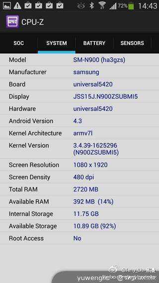 Quando Samsung ha annunciato il suo ultimo processore mobile, l’Exynos octa-core 5420, tutti abbiamo pensato che sarebbe stato montato sul Galaxy Note 3. Tuttavia, Samsung non ha ancora ufficializzato la cosa ma dall’immagine mostrata non c’è dubbio che il Note 3 abbia come chipset quest’ultimo Exynos. L’immagine mostra l’applicazione CPU-Z in esecuzione sul SM-N900 (il modello octa-core), e rivela anche che la RAM utilizzabile dei 3GB totali sarà di 2720MB.