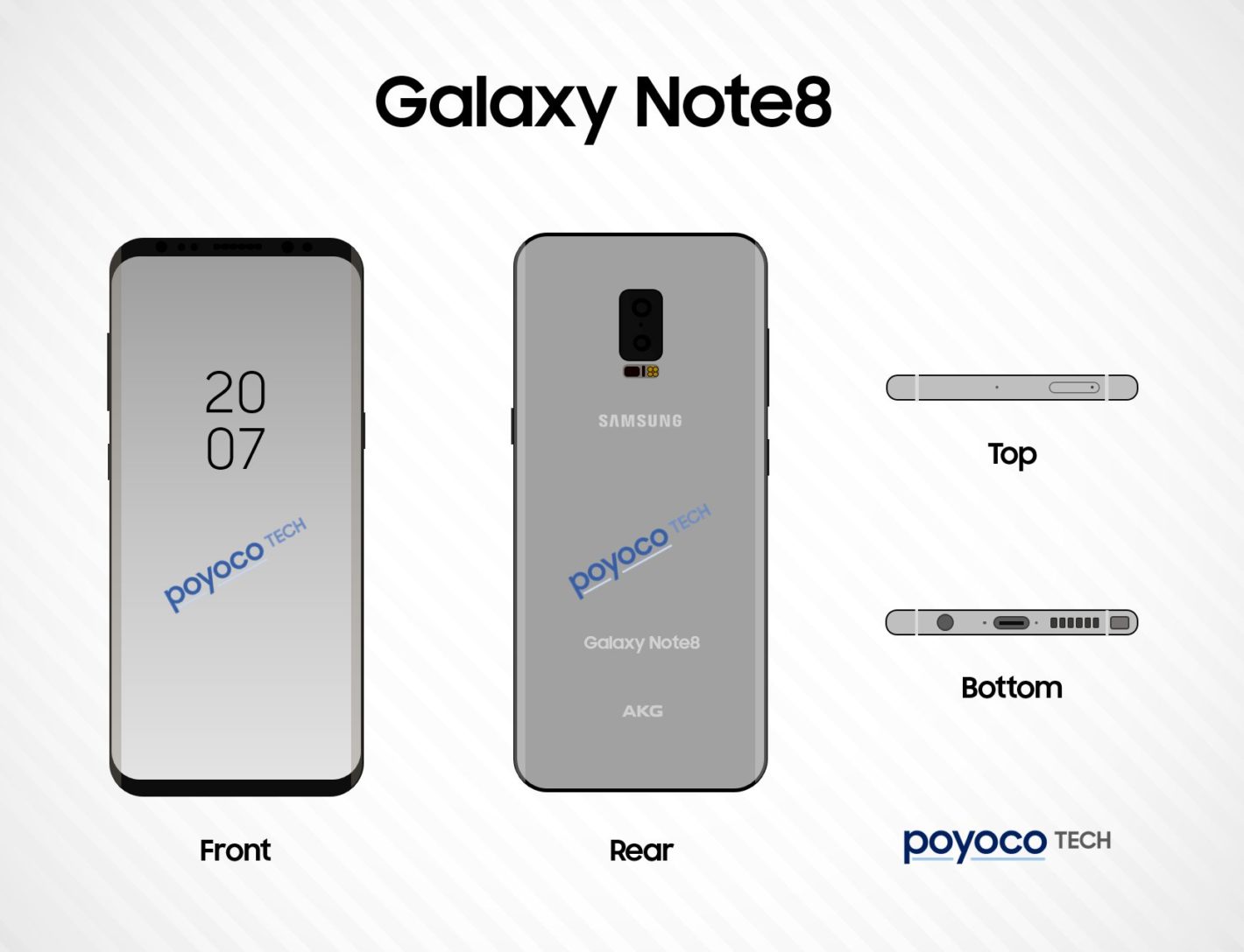 Samsung Galaxy Note 8: eccolo in un disegno schematico con Infinity Display e dual camera