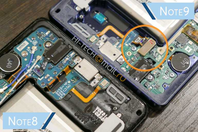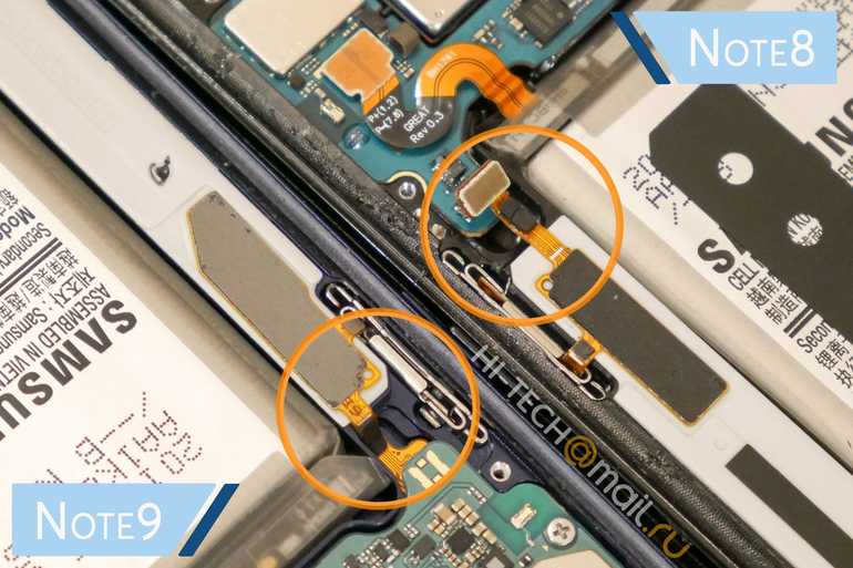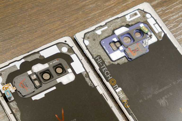 I modelli di fotocamera sono comparabili (anteriore e principale), tranne per il fatto che il connettore per il fissaggio dello scanner di impronte digitali si è spostato sotto le telecamere. La parte che contiene la S Pen nel Galaxy Note 9 è più affidabile, leggermente più ampia, per non creare rischi di danneggiamento dello slot della Pen in caso di caduta.