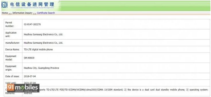 L’ente di certificazione TENAA ha visto registrare sui propri sistemi un nuovo dispositivo realizzato da Samsung che ha tutta l’aria di essere il futuro Samsung Galaxy Note 9. Il codice modello non mentirebbe trattandosi dell’SM-N9600. Purtroppo insieme alla certificazione non emergono dettagli tecnici del dispositivo, ma almeno abbiamo la conferma che il prodotto si sta realmente avvicinando al nostro mercato.