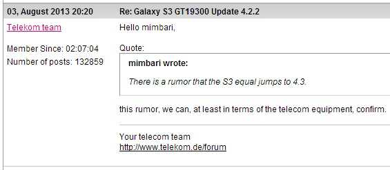 Ovviamente la notizia che arriva direttamente dal forum ufficiale di Deutsche Telekom riguarda la versione S3 personalizzata per l’operatore tedesco, ma rende sempre più reale il rumor che già tempo circola e che indica che Samsung salterà a piè pari Android 4.2.2 in favore di Android 4.3.