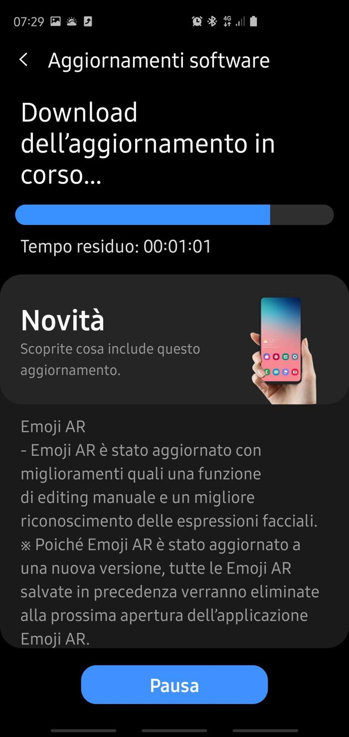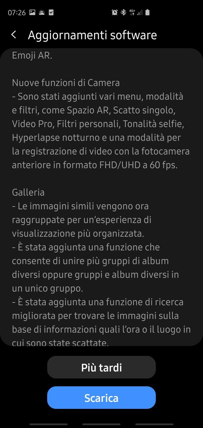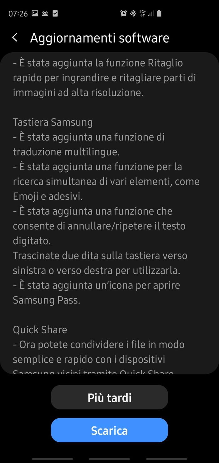 Emoji AR, Fotocamera, Galleria, Tastiera Samsung, Quick share e Music Share, oltre alle consuete correzioni di Bug.