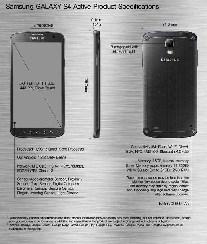 Il Galaxy S4 Active è dotato di un display da 5 pollici Full HD con tecnologia LCD (purtroppo per questo modello quindi niente display Super AMOLED), processore quad core da 1.9GHz, 2GB di Ram, fotocamera da 8 megapixel, 16 GB di memoria interna (11 utilizzabili) espandibili tramite slot microSD, connessioni LTE/HSPA+, Wi-Fi ac, IrDA, NFC, USB 2.0, Bluetooth 4.0 (LE), batteria da 2600mAh e sistema operativo Android Jelly Bean 4.2.2 con interfaccia proprietaria TouchWiz Nature UX.
