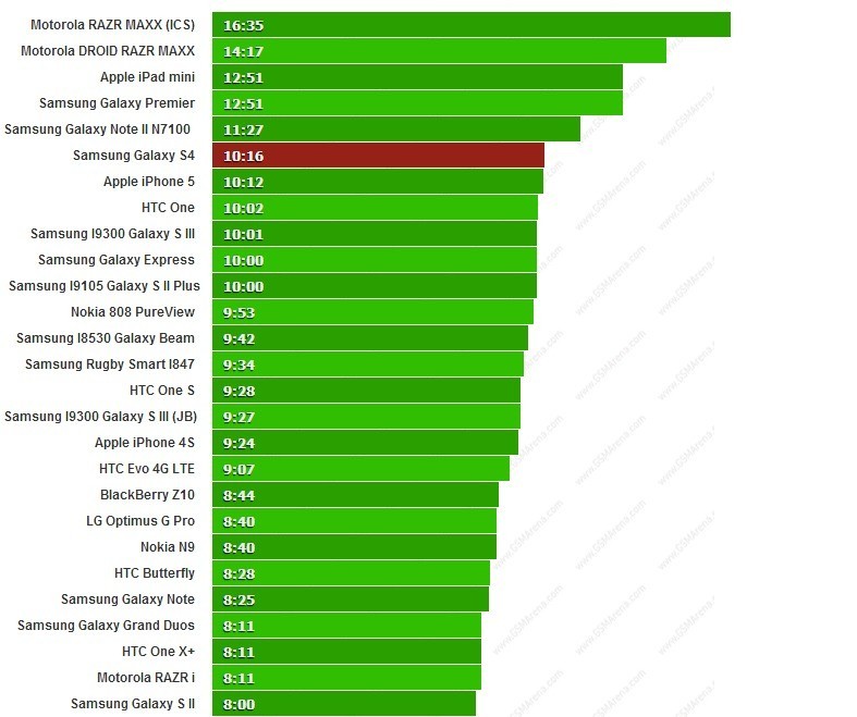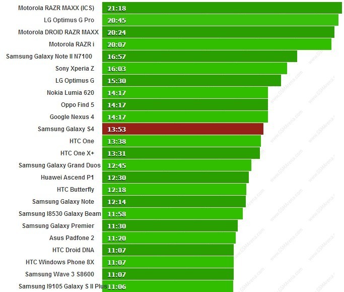 Nel test delle chiamate vocali il Galaxy S4 ha fatto registrare una durata di 13 ore e 53 minuti, in linea con con HTC One e meglio dell’iPhone 5 e di molti altri device Android!