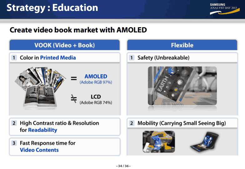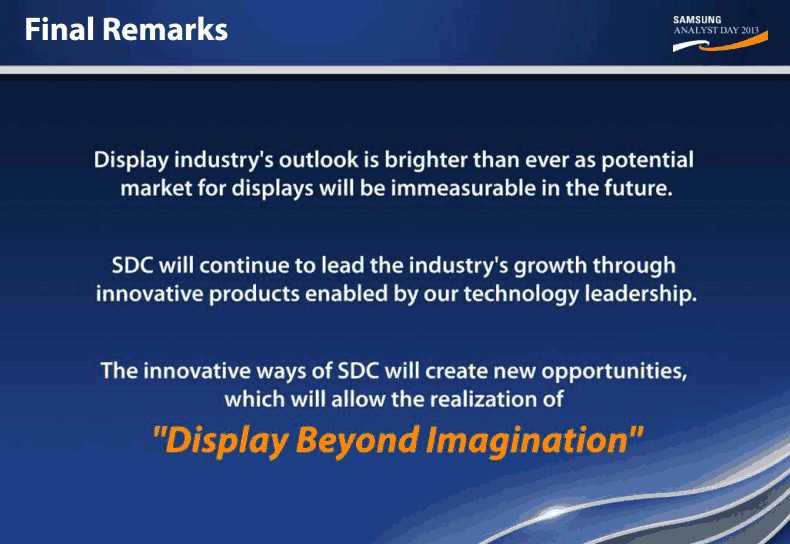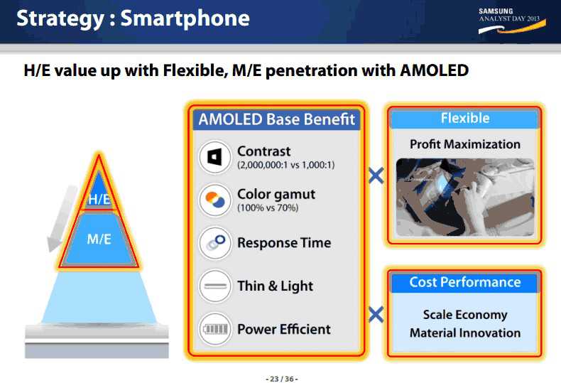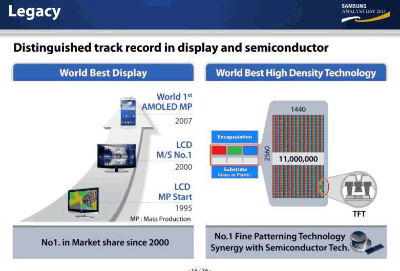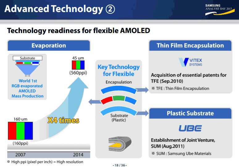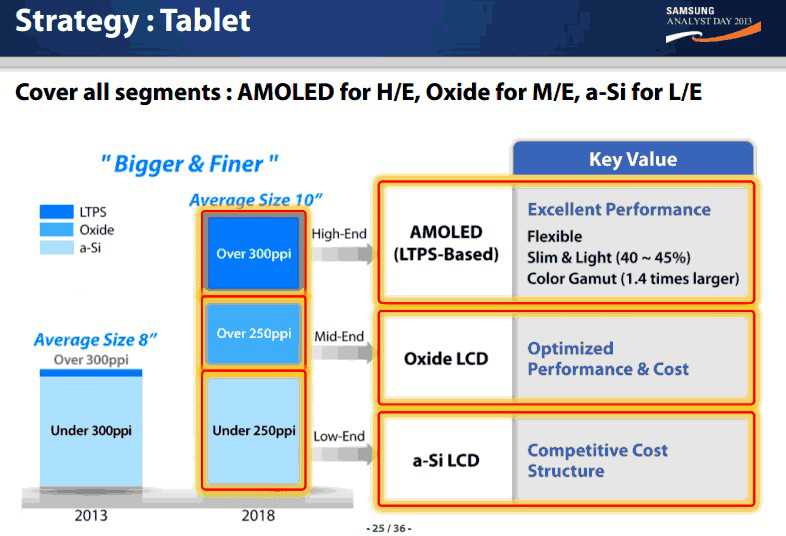 Dato che non erano ammessi giornalisti durante l’Analyst Day, la maggior parte delle voci su cosa c’è in cantiere erano trapelate da analisti coreani che erano presenti agli eventi. Ora, però, abbiamo tutta la presentazione del sui display Samsung creata dal CEO Kinam Kim, e sulla diapositiva numero 11, troviamo l’anno 2014 che è chiaramente indicato come l’anno nel quale Samsung aggiungerà ai suoi devices, display da 560ppi, AMOLED.
