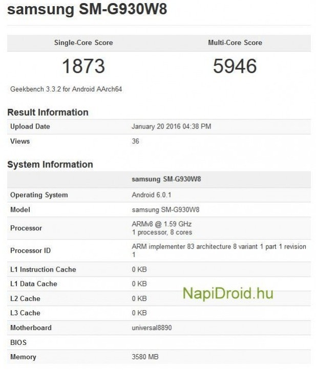 Il risultato del test prestazionale di Geekbench del Galaxy S7 con processore Exynos 8890, seppur da prendere con la dovuta attenzione essendo stato effettuato su prodotto sicuramente non ancora ottimizzato, riporta un punteggio di 1873 punti in modalità single-core e 5946 punti in quella multi-core, un buon salto in avanti rispetto all’attuale Galaxy S6 Edge con processore Exynos 7420, in grado di totalizzare 1495 punti in modalità single-core e 5375 punti in quella multi-core.