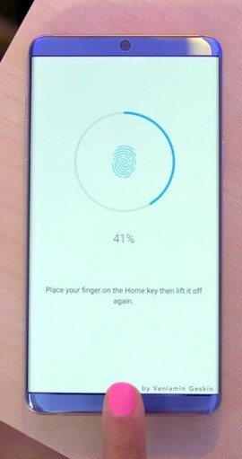 Il render è poi affiancato da un altro che mette in mostra il funzionamento del lettore di impronte digitali, altra caratteristica distintiva di Samsung Galaxy S8. Espunto infatti il tasto home, il colosso di Seoul dovrebbe infatti con ogni probabilità integrare il fingerprint sotto il display, utilizzando una tecnologia ad ultrasuoni in stile Xiaomi Mi5S. Per il resto poche variazioni rispetto a quanto chiacchierato: l’aspetto frontale del dispositivo è dominato dalla presenza di un display a dimensione maggiore rispetto agli attuali standard della famiglia Galaxy S, con cornici ridottissime sulla parte superiore ed inferiore, caratterizzata in questo caso dalla sola presenza del logo Samsung.