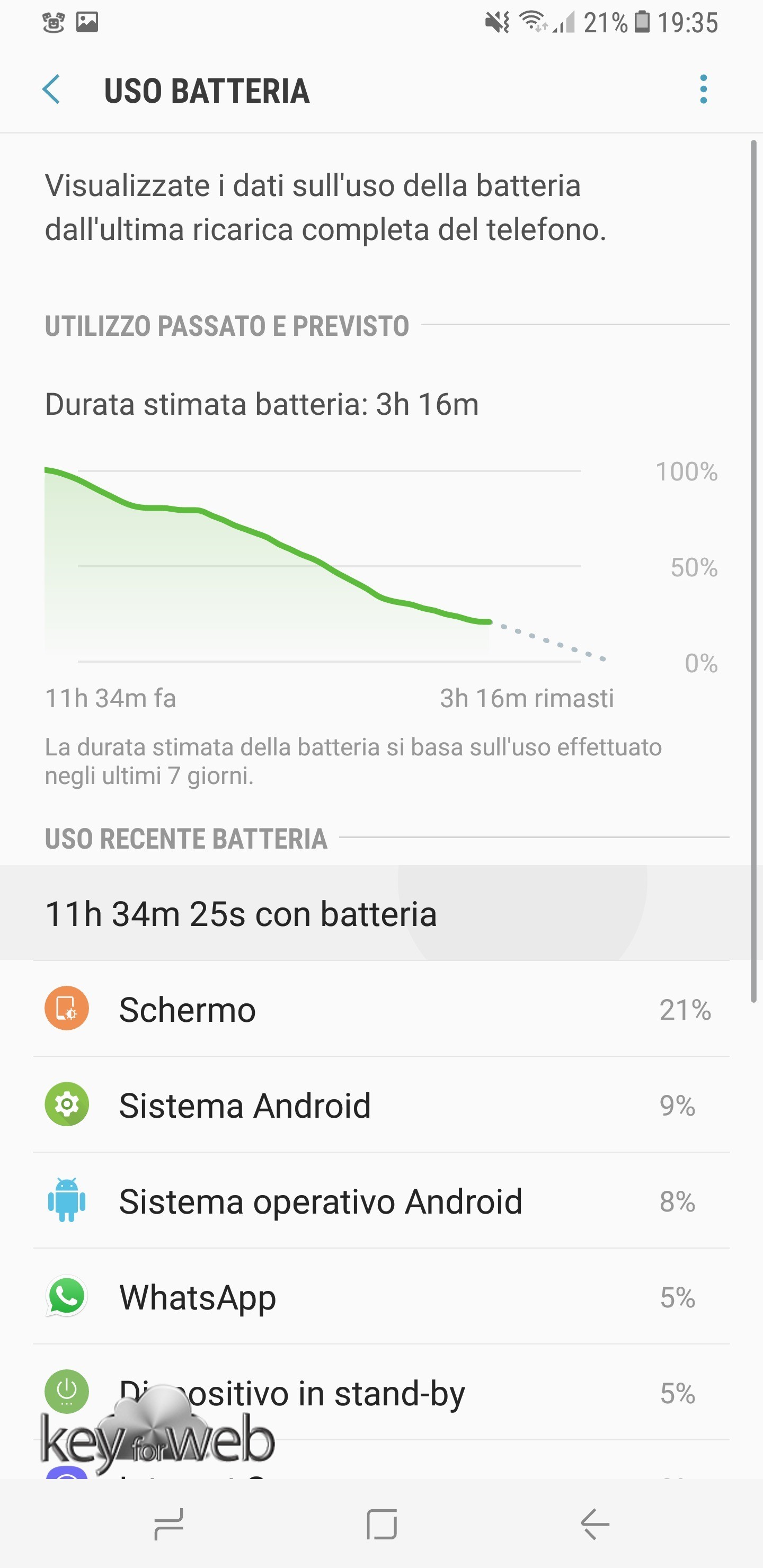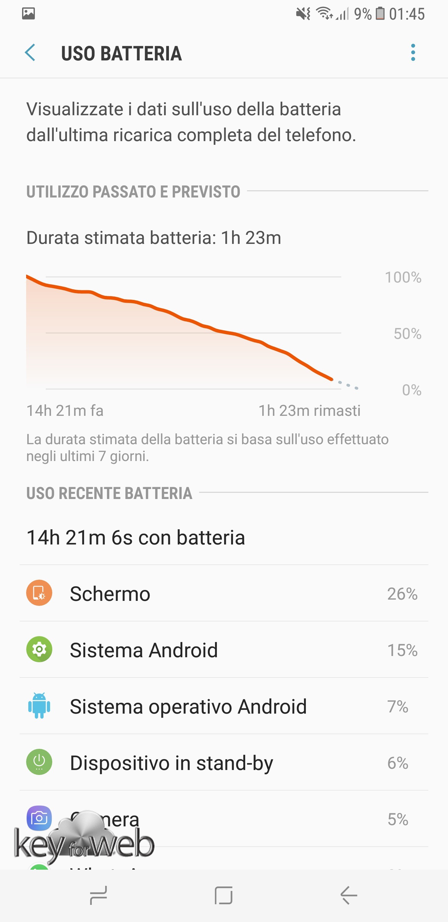 Il modello da 6,2” di Samsung Galaxy S8 presenta una batteria da 3500 mAh che è esattamente quella di Samsung Galaxy Note 7 sia per dimensioni, metodo costruttivo, “ganci” di supporto, tensione ed amperaggio. Fino ad ora non ci è scoppiato in faccia e speriamo che non lo faccia mai. La batteria ha una buona autonomia e la differenza di 100 mAh in meno rispetto Samsung Galaxy S7 Edge non viene percepita. Diciamo che con un uso normale, che comprende 4G, Wi-Fi, giochini vari, spulciare e-mail, scattare foto e registrare video, lo smartphone ci ha portato fino a sera senza problemi. Gli screen sopra vi mostrano l’andamento della batteria e le ore di schermo attive. Non siamo nemmeno arrivati ad un livello così basso tale da attivare il risparmio energetico. Autonomia quindi davvero buona.