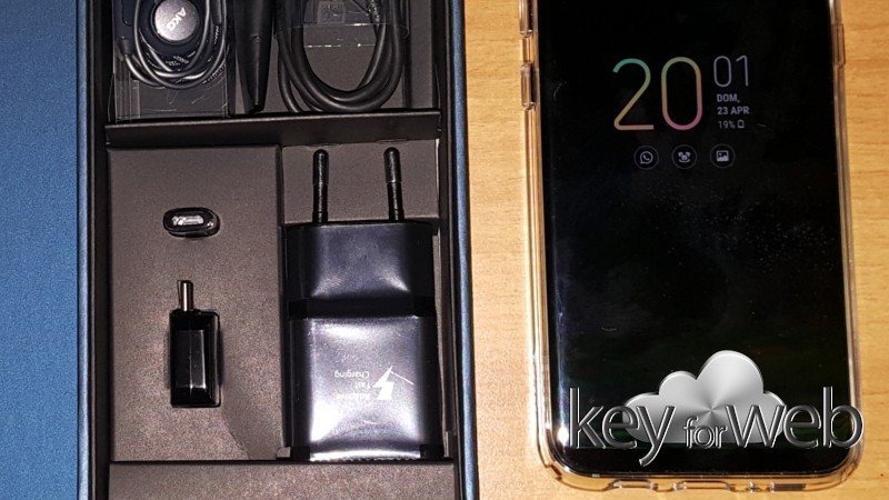La confezione di vendita di Samsung Galaxy S8+ non è troppo grande, forse è anche questo a stupire perché si pensa “come fa un 6,2” di schermo a stare li dentro? Mi avranno di certo mandato la versione più piccola”. Invece no, eccolo il gigante buono (davvero buono in ogni suo minimo aspetto). All’interno della confezione troviamo un alimentatore per la ricarica rapida 9V/2A, un cavo USB/USB-C, un adattatore da micro USB a USB-C e un adattatore OTG. Non dimentichiamo poi i nuovi auricolari in-ear di AKG che sono davvero di ottima qualità.