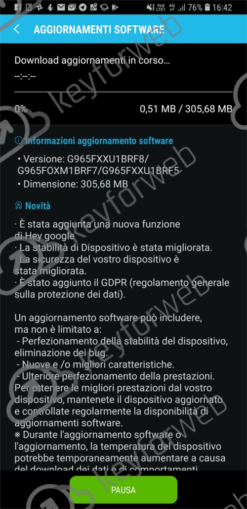 - Versione: G965FXXU1BRF8/G965FOXM1BRF7/G965FXXU1BRF5