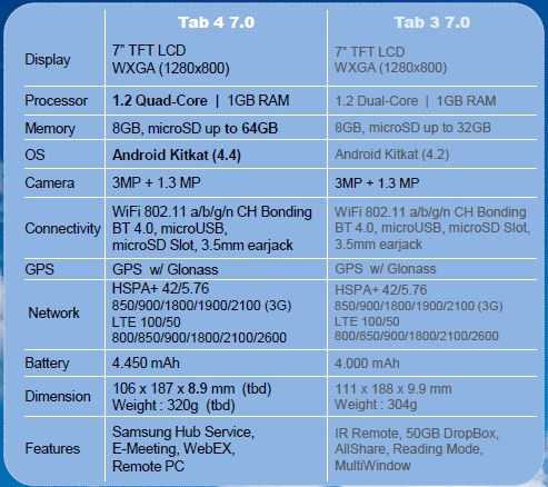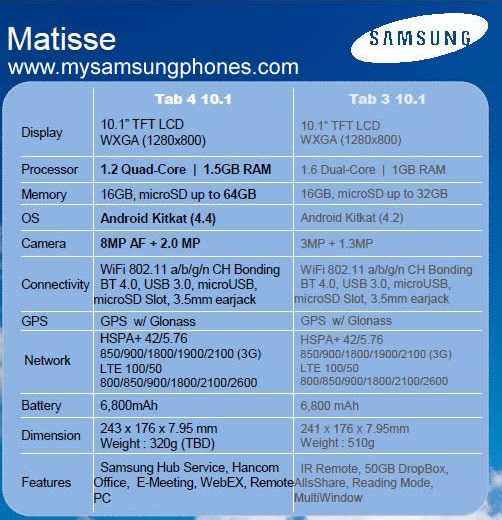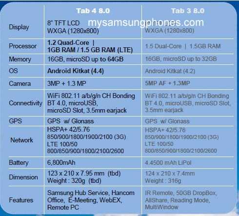 Sul sito mysamsungphones.com appaiono le schede tecniche di tre modelli di tablet Samsung della linea Galaxy Tab 4. I tre modelli apparsi sarebbero da 7, 8 e 10.1 pollici e ognuno di loro avrà tre varianti: