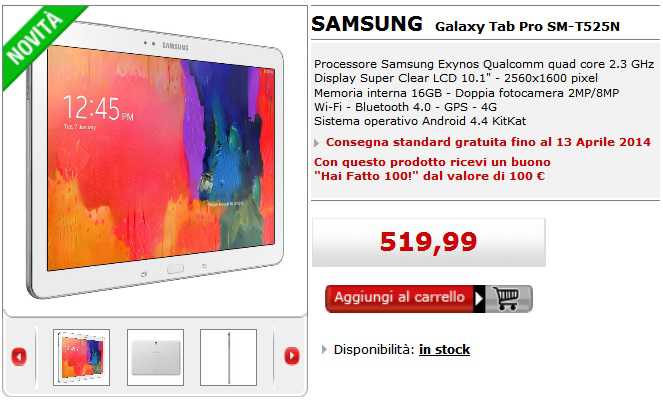 MediaWorld propone il Samsung Galaxy Tab Pro 10.1 a 520€ in abbinamento alla promozione “Hai fatto 100″ di cui vi abbiamo scritto. Per maggiori informazioni vi lasciamo con il link del sito online di MediaWorld.