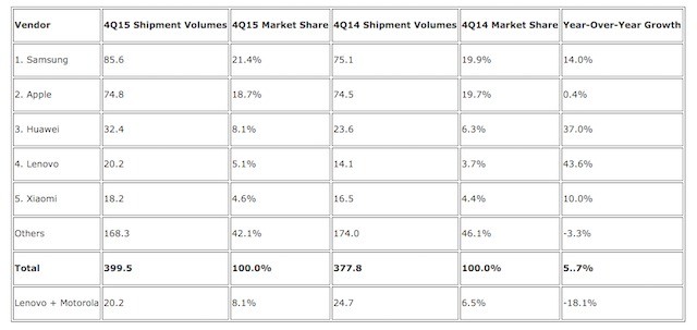 Da alcune ore sono stati svelati dalla International Data Corporation (IDC) i numeri relativi alla distribuzione mondiale di smartphone relativi al 2015 riportanti dati, nonostante la crisi globale, ancora in forte crescita e cifre da capogiro, con ben 399.5 milioni di smartphone distribuiti nel solo Q4 2015, con un incremento del 5.7% rispetto allo stesso periodo del 2014 e sopratutto utili per stilare una classifica dei produttori che indica ancora una volta Samsung leader mondiale del settore smartphone.
