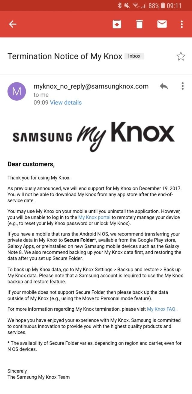 Samsung My Knox, disattivazione del servizio dal 19 dicembre
