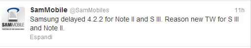 Pessime notizie per tutti i possessori di Galaxy S3 e Galaxy Note 2. SamMobile, la fonte probabilmente più accreditata riguardo ai rumor del mondo Samsung, ha appena cinguettato di un ritardo non quantificato relativo al rilascio dell’aggiornamento a Jelly Bean 4.2.2 per i due terminali in oggetto. Stando alla stessa fonte pare che il ritardo sia dovuto alla nuova interfaccia Touch Wiz Nature UX e al suo probabile adattamento, in termini di risoluzione e di funzionalità, ai due dispositivi.