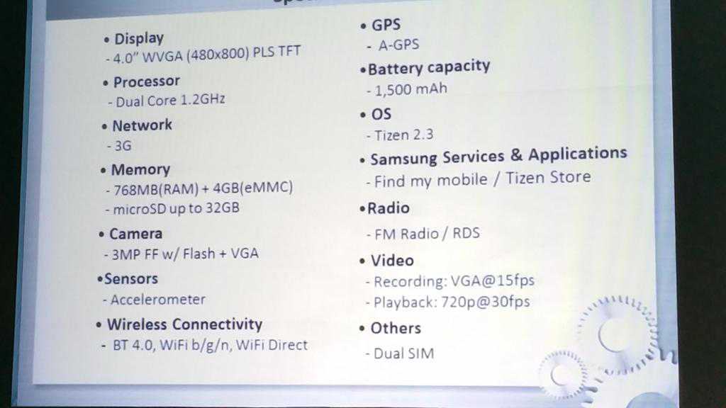 In questa occasione di presentazione del Samsung Z1, sono emerse le specifiche complete e alcune caratteristiche chiave dello smartphone, trapelate da un rivenditore locale. Il Samsung Z1 dispone di Tizen 2.3 e presenta un display minimale PLS TFT da 4 pollici con una risoluzione di 800 x 480 pixel; il processore è un dual-core da 1.2GHz, 768MB di RAM, 4GB di memoria interna, uno slot per schede microSD e una batteria di 1500 mAh.