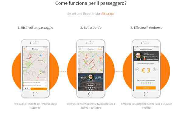 Scooterino, un app californiana nata dall’idea di un italoamericano, consente di accordarsi tra privati per un passaggio in scooter nella città eterna a fronte di un piccolo rimborso spese.