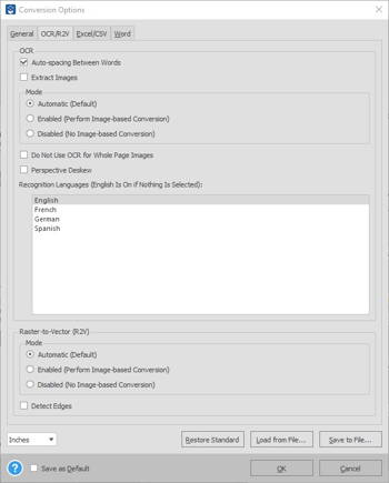 È possibile accedere a questa funzione dalla finestra di dialogo “Opzioni di conversione” (tramite la scheda Converti documento) e selezionare le lingue che desideri vengano rilevate dal motore OCR.