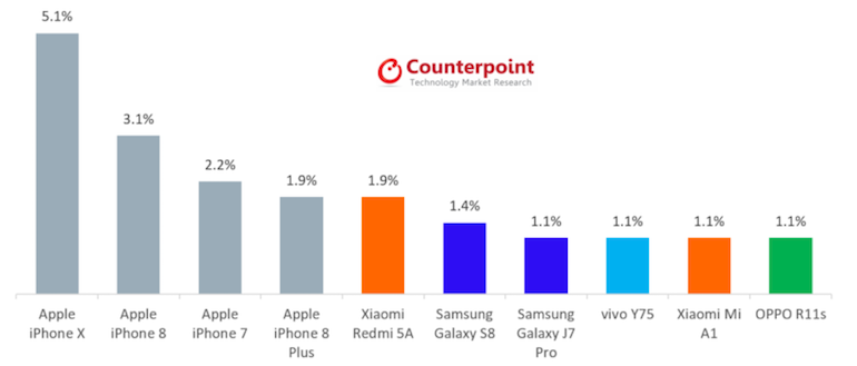 L’azienda di analisti proviene da Counterpoint Research, la stessa che riporta come il volume delle vendite di Apple sia aumentato del 5% rispetto allo stesso mese dello scorso anno. I primi quattro smartphone più venduti a livello globale sarebbero proprio iPhone X (5.1%), seguito da iPhone 8 (3.1%), iPhone 7 (2.2%) e iPhone 8 Plus (1.9%). Dietro ai dispositivi dell’azienda californiana si è posizionato il Samsung Galaxy S8, in sesta posizione con l’1.4% del mercato. Nessun dato per il Galaxy S9, rilasciato solo a marzo.