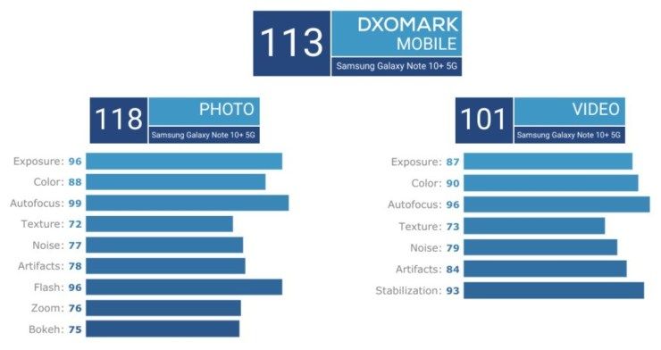 Il Galaxy Note 10+ 5G ha ottenuto il primo posto nella scala DxOMark Selfie per la sua fotocamera frontale con un punteggio di 99, e ha anche ottenuto il primo posto, guadagnando un punteggio totale complessivo di 113, per le sue fotocamere posteriori.