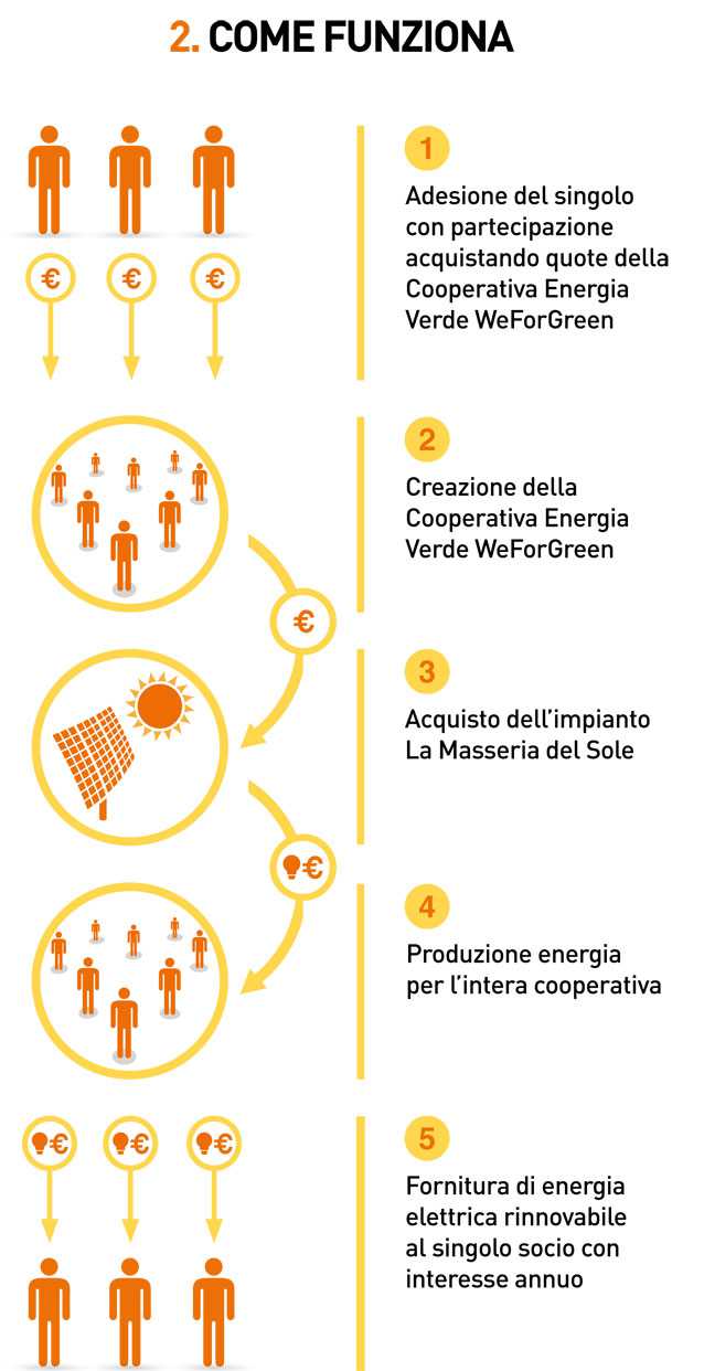 Acquistando le quote proposte dal progetto Solar Share si diventa soci della Cooperativa Energia Verde WeForGreen attraverso una formula che tutela nel lungo periodo e consente di partecipare all’acquisto dell’impianto solare La Masseria del Sole. I Soci potranno quindi consumare l’energia prodotta dall’impianto collettivo che sfrutta solo fonti rinnovabili, con tagli tangibili nel costo della bolletta della luce, oltre a  ridurre l’impatto sull’ambiente.