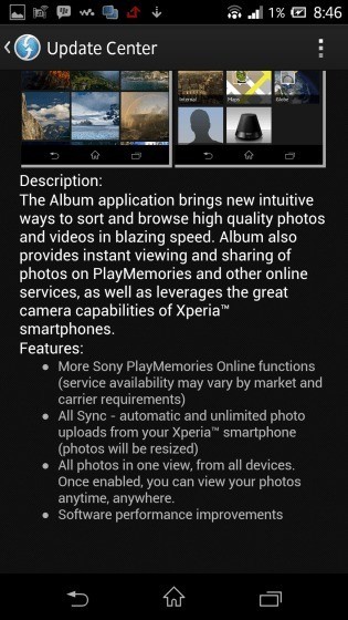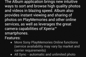 Sony ha rilasciato una nuova build della sua applicazione Album che sembra portare miglioramenti delle prestazioni. La nuova versione è la 5.2.A.1.20 che sostituisce la 5.2.A.0.6 porta una serie di nuove funzionalità tra cui PlayMemories Online che permette di sincronizzare foto e video sul cloud. L’aggiornamento è distribuzione Xperia Z compreso l’Xperia Z1, Z, Z Ultra, ZL e ZR.