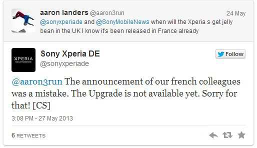 La divisione tedesca di Sony ha rilasciato una cattiva notizia via twitter per i proprietari dell’ Xperia S dichiarando che non è in programma nessun roll out per l’aggiornamento ad Android Jelly Bean 4.1.2 per il loro device e che la divisione francese di Sony ha sbagliato a comunicarne l’uscita alcuni giorni fa sempre attraverso twitter.
