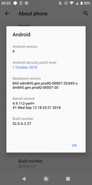 Dalle informazioni raccolte, l’aggiornamento sarebbe in distribuzione over-the-air (OTA) con una dimensione del file di 1.059 MB e sarebbe indicato con numero di build 52.0.A.3.27 ed includerebbe anche le ultime patch di sicurezza relative ad ottobre 2018.