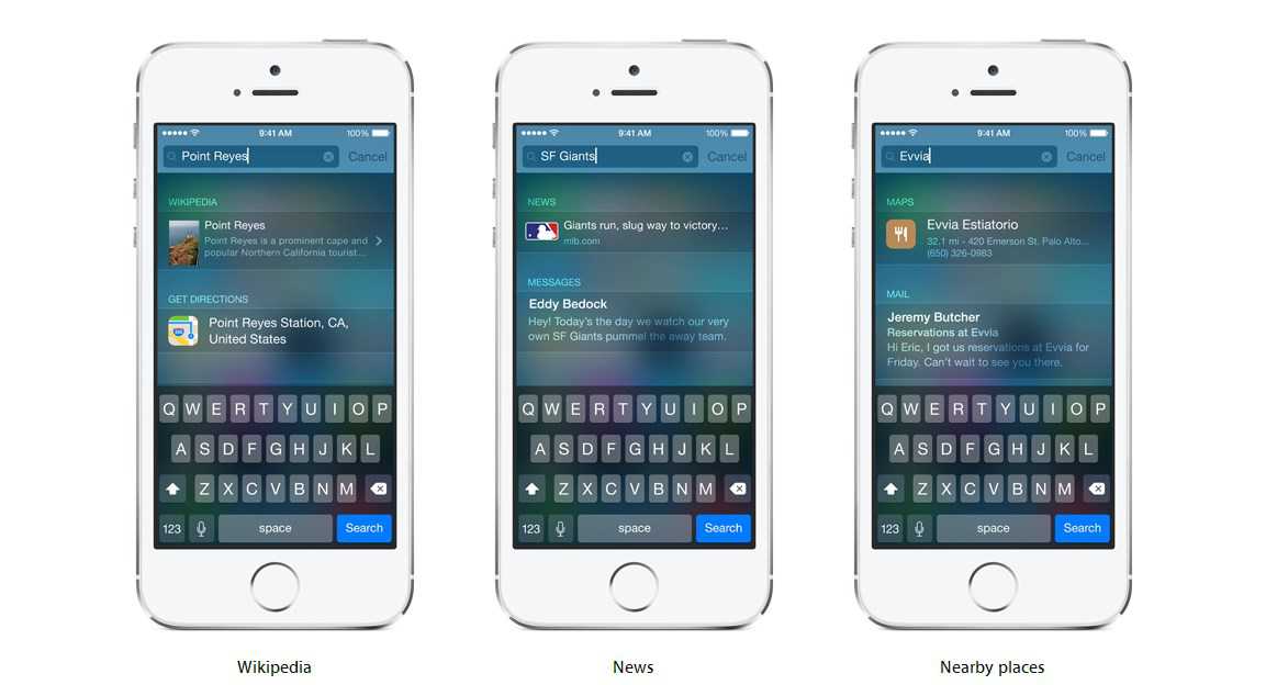 Il nuovo motore di ricerca di iOS 8 è una vera rivoluzione rispetto al passato, permettendo di effettuare ricerche ovunque, nelle news, nella app installate nel dispositivo, nei punti di interesse, all’interno delle canzoni presenti su iTunes e molto altro ancora. Tutto dal campo di ricerca di Spotlight.