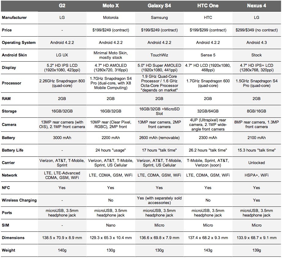 Con l’uscia ufficiale dell”LG G2 è giusto fare un piccolo confronto diretto delle sole caratteristiche tecniche per i modelli di punta delle case più note. Dal momento che il G2 è il primo sul pianeta ad utilizzare il nuovissimo Qualcomm Snapdragon 800, un nuovo IPS con tecnologia dell’esposizione, e lo stabilizzatore ottico d’immagine nella fotocamera posteriore da 13mpx, sicuramente sovrasterà i diretti concorrenti come Galaxy S4, HTC One, Moto X, e Nexus 4, almeno sulla carta.
