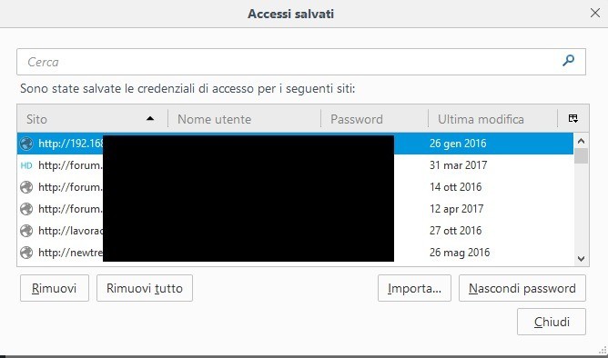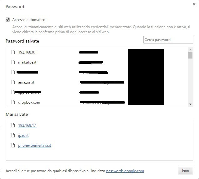 - Qui si aprirà una scheda con tutti i vari siti ed account salvati, cliccate su “Mostra password” ed il gioco è fatto.