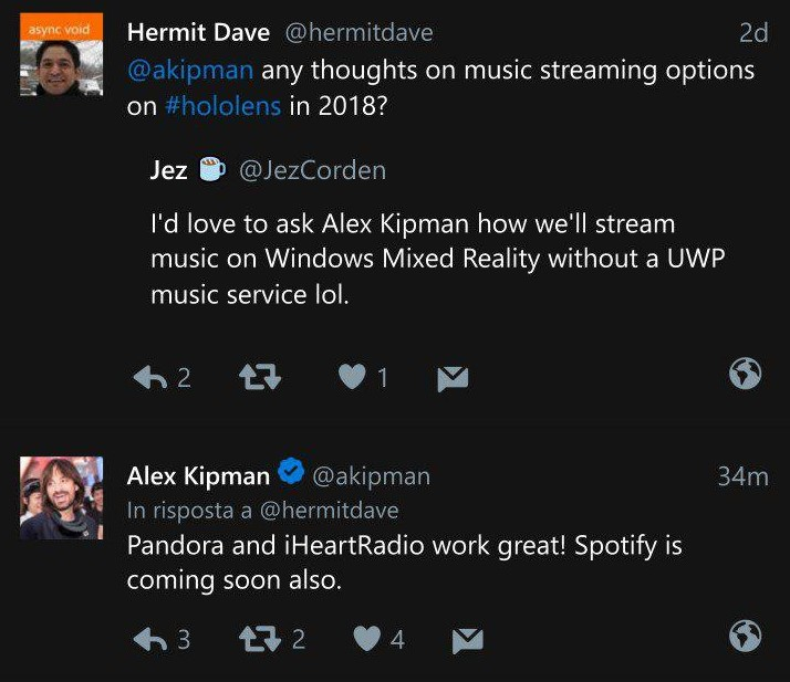 E’ direttamente Alex Kipman, responsabile del progetto Hololens all’interno del colosso di Redmond, a darne conferma in un tweet con Hermit Dave conversando sulla possibilità che nella Mixed Reality vengano introdotti servizi di streaming musicale.