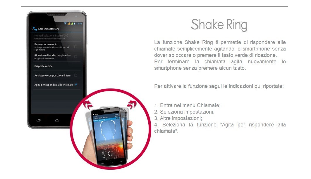La prima si chiama Shake Ring, e consente di rispondere alle chiamate semplicemente agitando lo smartphone senza dover sbloccare o premere il tasto verde di ricezione. Lo stesso procedimento vale anche quando si desidera terminare la chiamata, basterà semplicemente agitare nuovamente il telefono. Un’applicazione davvero utile che semplificherà l’accesso alla chiamata e la rapidità nella risposta. La funzione si attiva molto semplicemente entrando nelle “altre impostazioni” e selezionando “agita per rispondere alla chiamata”.