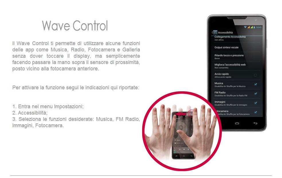 Attivando la seconda applicazione Wave sarà invece possibile migliorare l’esperienza d’uso con il proprio smartphone. Per scattare foto, scorrere le immagini della galleria, oppure cambiare canzone o la frequenza della radio servirà più soltanto passare la mano sopra il sensore senza toccare alcun tasto!