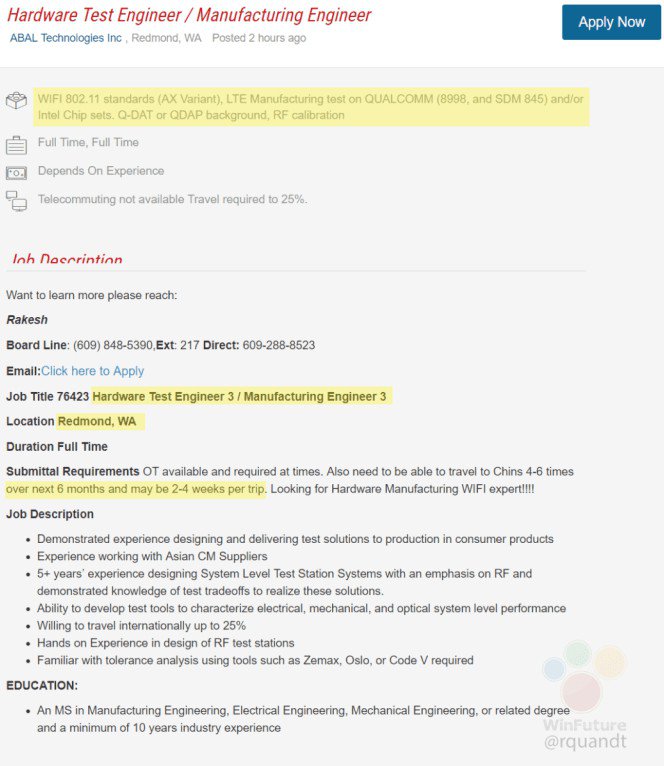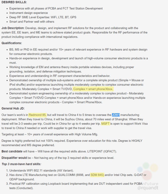 L’annuncio, dove il committente è identificato come MSFT, è rivolto alla ricerca di un ingegnere hardware con esperienza con SDM845 e conoscenze su dispositivi quali console, smartphone e lettori MP3.