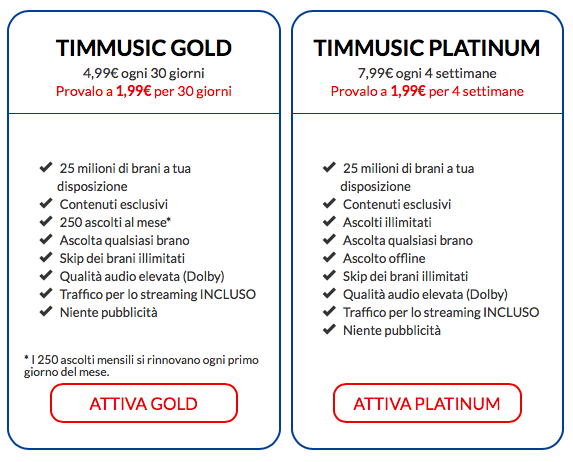 I nuovi clienti dovranno necessariamente recarsi in un centro Tim nell’ipotesi di attivazione della seconda offerta, mentre i già clienti potranno attivarla online. Per coloro che sono interessati alle differenze tra TIMMUSIC Gold e Platinum consigliamo di fare riferimento all’immagine sottostante.