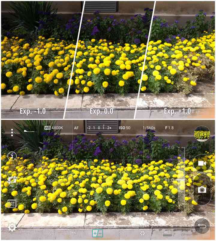 Nell’applicazione fotocamera, toccando lo schermo per impostare il punto dove impostare il fuoco non cambierà l’esposizione dell’immagine. In generale, il G4 LG espone le immagini abbastanza bene, ma se si pensa che la modalità automatica della fotocamera produce foto che sono un po’ “troppo chiare” o “troppo scure”, passare alla modalità manuale e provare a regolare l’esposizione. Il cursore di compensazione dell’esposizione viene attivato premendo il terzo pulsante in basso. Ora è possibile impostare l’esposizione desiderata e lasciare che la fotocamera si prenda cura di tutto il resto. Si noti che il cursore di compensazione dell’esposizione funziona solo quando il AE-L (auto blocco dell’esposizione) toggle è off.